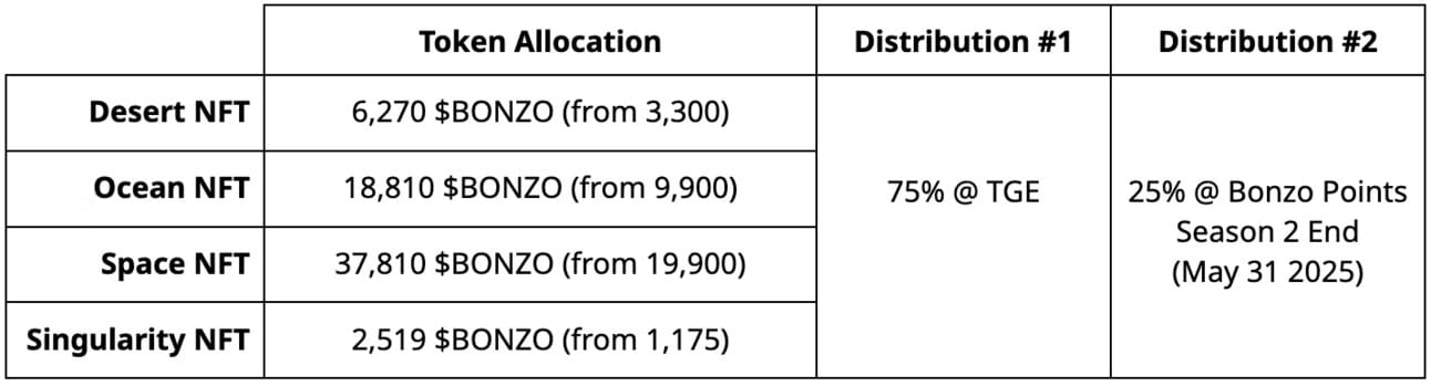 Claimable $BONZO for Pre-Season Points: 0.5% of the maximum supply (2,000,000 $BONZO) will be distributed (made “claimable”) at TGE, for Bonzo Pre-Season Point earners.