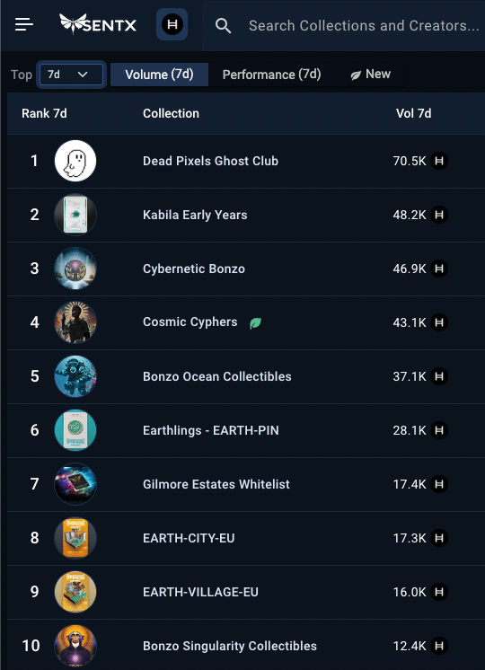 Three Bonzo NFTs ranked in the top 10 for 7-day volume on SentX, with a combined total of 96.4K HBAR traded: Cybernetic Bonzo (#3) with 46.9K HBAR, Ocean Bonzo (#5) with 37.1K HBAR, and Singularity Bonzo (#10) with 12.4K HBAR.