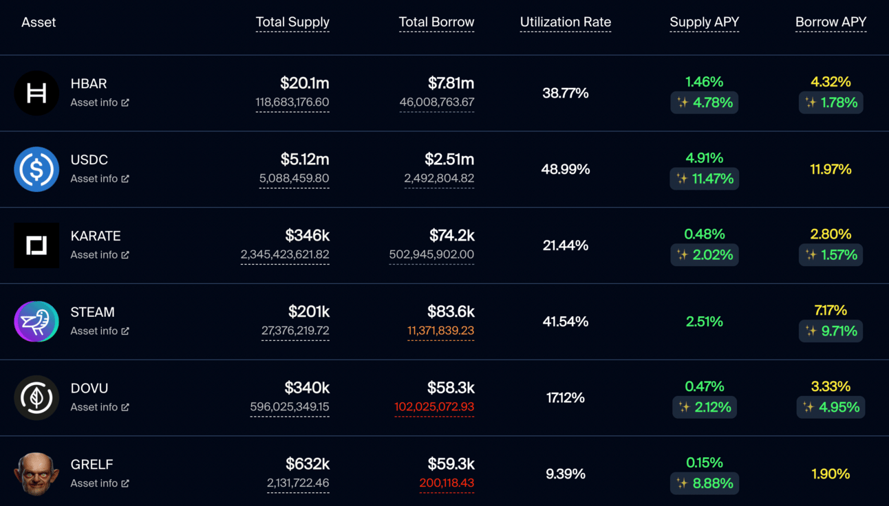 Bonzo Finance continues to offer liquidity incentives (✨) for supplying and/or borrowing $HBAR, $USDC, $KARATE, $DOVU, $STEAM, & $GRELF.