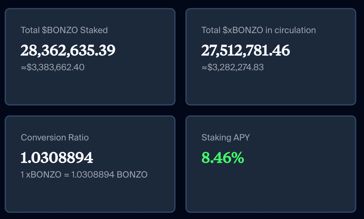 Over 28 million $BONZO governance tokens are staked on app.bonzo.finance/stake, representing close to one-third of the total circulating supply.